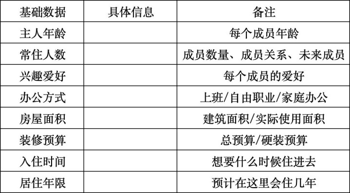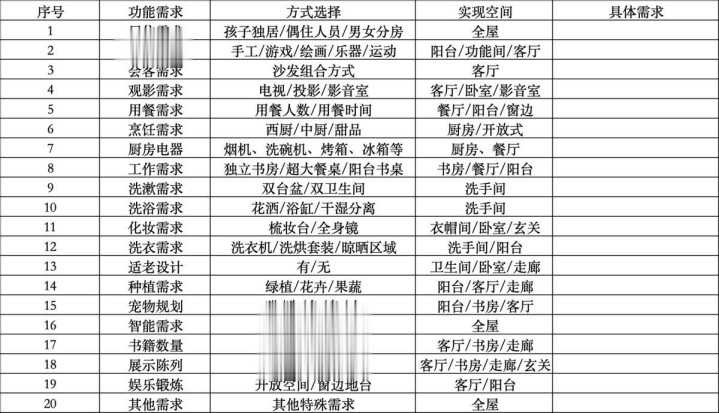 为了戒备内行遗漏,我把个东谈主需求分为五大部分并整理成了表格,差异是基础需求、生计需求、收纳需求、电器需求以及立场喜好,无论你是自装一经找诡计师,惟有明确了个东谈主需求,智商作念到少踩坑,不返工。