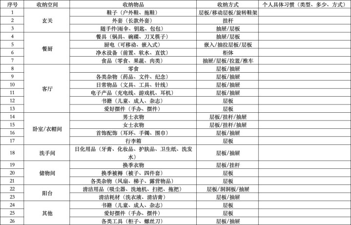 而是应该作念到动线合理,不错唾手取用,唾手放回。不然拿个东西要走很远,那用完后大都不会放且归。因此我把常见的收纳需求整理了一个表格,内行不错阐述具体需求来进行退换。